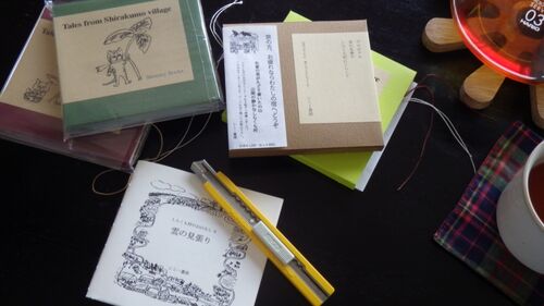 1週間連休、2日目。 今朝は風が気持良く吹いています。 昨日はネット廃人になっていたので 本日はのんびりと絵本をながめることにしました。 では、カッターを用意。 ??? 先日、芸術の森美術館のミュージアムショップで見つけた 豆絵本「しらくも村おはな…
